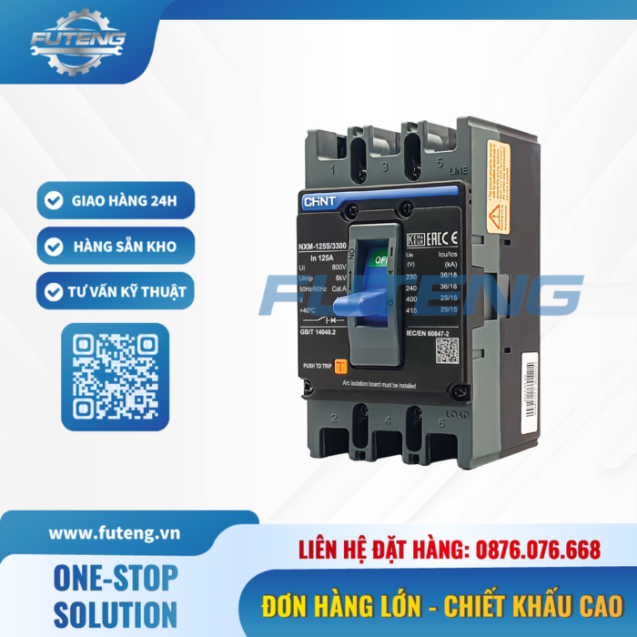 MCCB 3P 125A CHINT chính hãng, đảm bảo an toàn điện, chống quá tải, ngắn mạch, rò điện. Phù hợp nhà xưởng, công trình, hệ thống điện công nghiệp. Futeng cung cấp đa dạng thương hiệu, giá cạnh tranh, giao nhanh 24–48h. Liên hệ hotline 0876.076.668 để được báo giá.